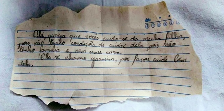Ainda conforme a PM, uma carta foi localizada ao lado da recém-nascida. No bilhete, a mãe explicava que não tinha condições de criar a menina, que recebeu o nome de Yasmin, bem como não ter família nem residência em Penápolis. A polícia acredita que a criança nasceu entre a noite de domingo (10) e a madrugada desta segunda.