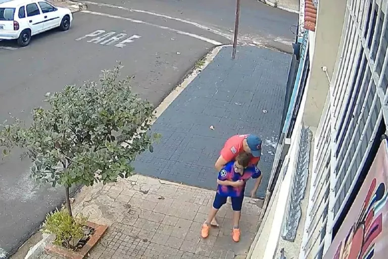 Câmera de segurança filmou pai salvando o filho com manobra que envolve pressão contra o diafragma para desobstrução das vias aéreas superiores.
