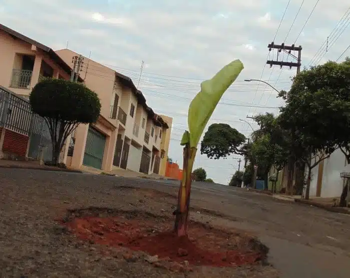 Rua tem diversos buracos que dão prejuízos aos motorista e podem causar acidentes. Árvore foi ‘plantada’ na terça-feira (19) para evitar acidentes, dizem moradores.