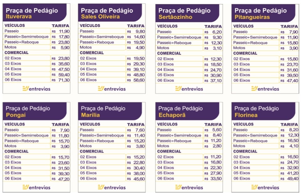 Confira, na tabelas abaixo, as novas tarifas (válidas para veículos de passeio, motocicletas e, em caso de veículos comerciais, por eixo) nas praças administradas pela Entrevias na região de Marília, na rodovia SP- 333 em Pongaí, Marília, Echaporã e Florínea. Na região de Ribeirão Preto, nas rodovias Anhanguera (SP-330), Attílio Balbo (SP-322) e Armando Salles Oliveira (SP-322), em Ituverava, Sales Oliveira, Sertãozinho e Pitangueiras.