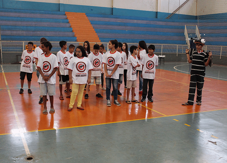 Após isso foi montado um circuito na quadra com a mesma temática de prevenção em que as crianças tiveram que cumprir metas em 5 bases no menor tempo possível.