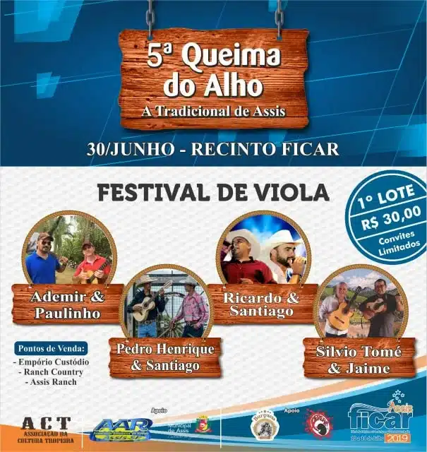 A Queima do Alho é organizada em parceria com a Associação Assisense de Rodeio – AAR, Associação da Cultura Tropeira – ATC, com o apoio da Prefeitura Municipal de Assis e fazem parte do cronograma oficial de eventos da Ficar 2019.