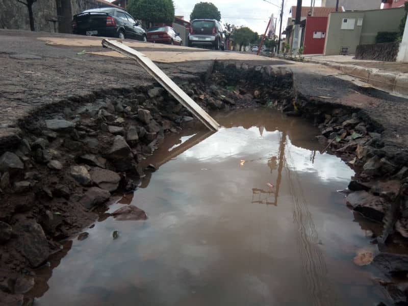 A via, que passava por obras da Sabesp, estava cortado para manutenção em tubulações. Com a forte enxurrada causada pela chuva, parte do asfalto se desprendeu.