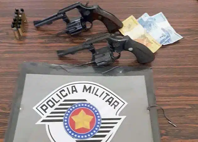 Os policiais fizeram busca pessoal e localizaram no bolso da bermuda, mais uma munição calibre 38 intacta, documento de identidade e R$ 24 em dinheiro. Quando a viatura do apoio chegou, auxiliou na busca veicular, onde foi localizado outro revólver calibre 38, marca Taurus special, carregado com seis munições intactas.