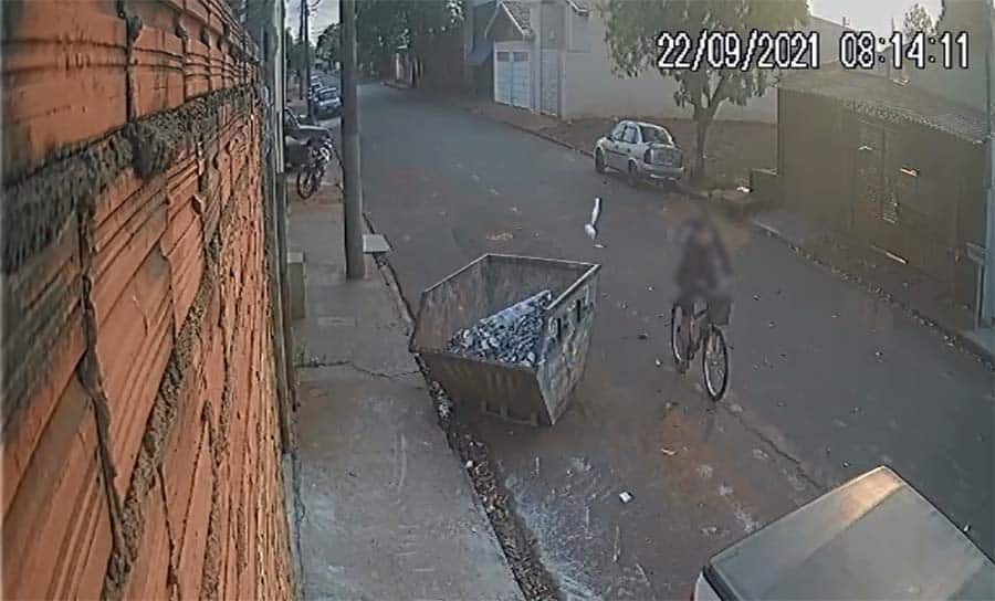 Câmeras de segurança registraram o momento em que uma mulher, em uma bicicleta, joga uma sacola com um filhote de gato em uma caçamba de entulho, na rua Miguel Antonucci, em Cândido Mota (SP).