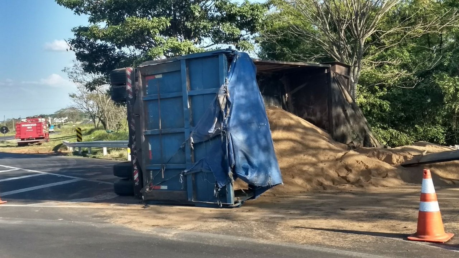 Segundo informações da Polícia Rodoviária, caminhão bateu em outra carreta antes de tombar.