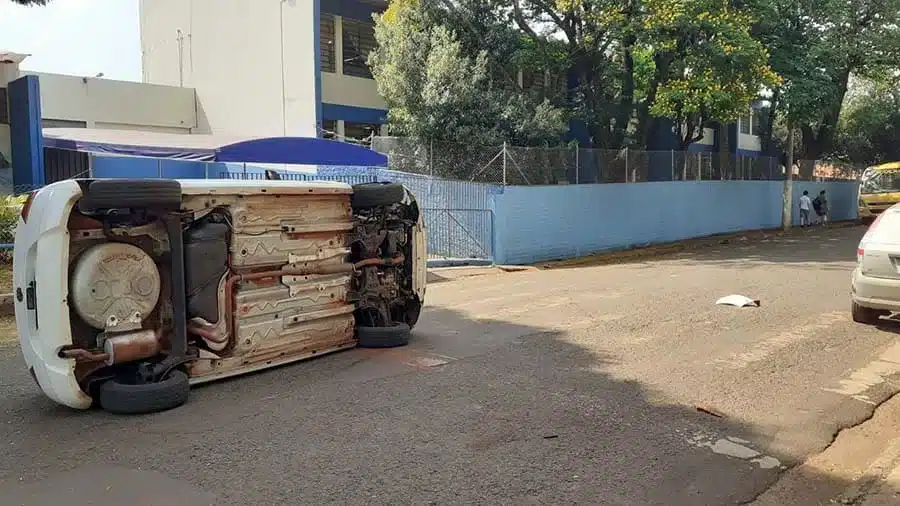 Um veículo VW Gol tombou na tarde desta terça-feira (28), após colidir em outro veículo, um Ford Fiesta, na rua dos Mestres, ao lado da escola estadual ‘Rachid Jabur’, em Cândido Mota (SP).