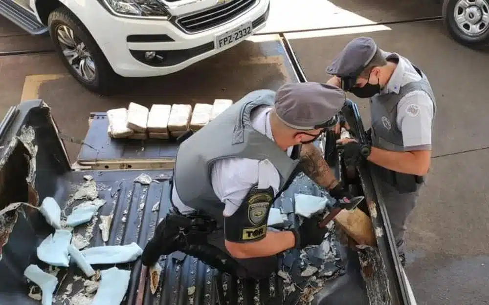 Após buscas no automóvel, a polícia encontrou um fundo falso na lateral da carroceria da caminhonete onde encontrou 61 tabletes de crack escondidos, que pesaram 63,9 quilos.