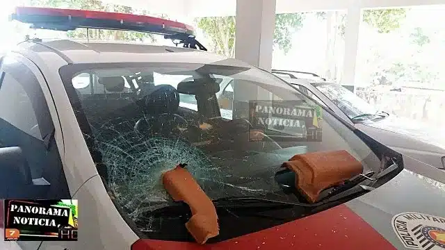 Diante dos fatos, os policiais começaram uma verbalização para que o homem soltasse a enxada, ordem que não foi atendida. Em seguida, o autor foi para o telhado do vizinho, começou a retirar as telhas e arremessá-las contra os policiais, que se abrigaram atrás da viatura, que acabou danificada pelo material.