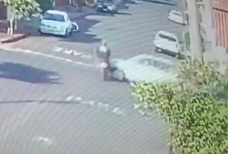 Nas imagens é possível ver quando o motociclista segue pela via e acaba avançando o sinal de PARE, momento em que é atingido por um carro que seguia na outra via. Com forte impacto, o motociclista é arremessado.