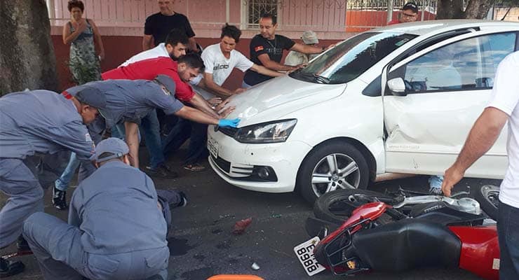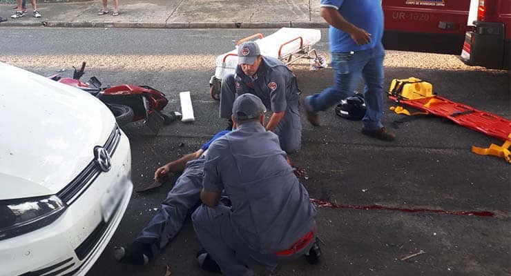O motociclista ficou preso embaixo do VW/Fox. Ele aparentou ter sofrido múltiplas fraturas, sendo uma delas exposta no braço esquerdo, fazendo-o perder muito sangue.