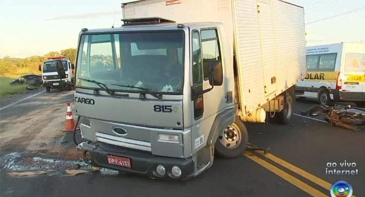 Um motociclista que seguia logo atrás do caminhão colidiu na lateral da carroceria e caiu na pista.