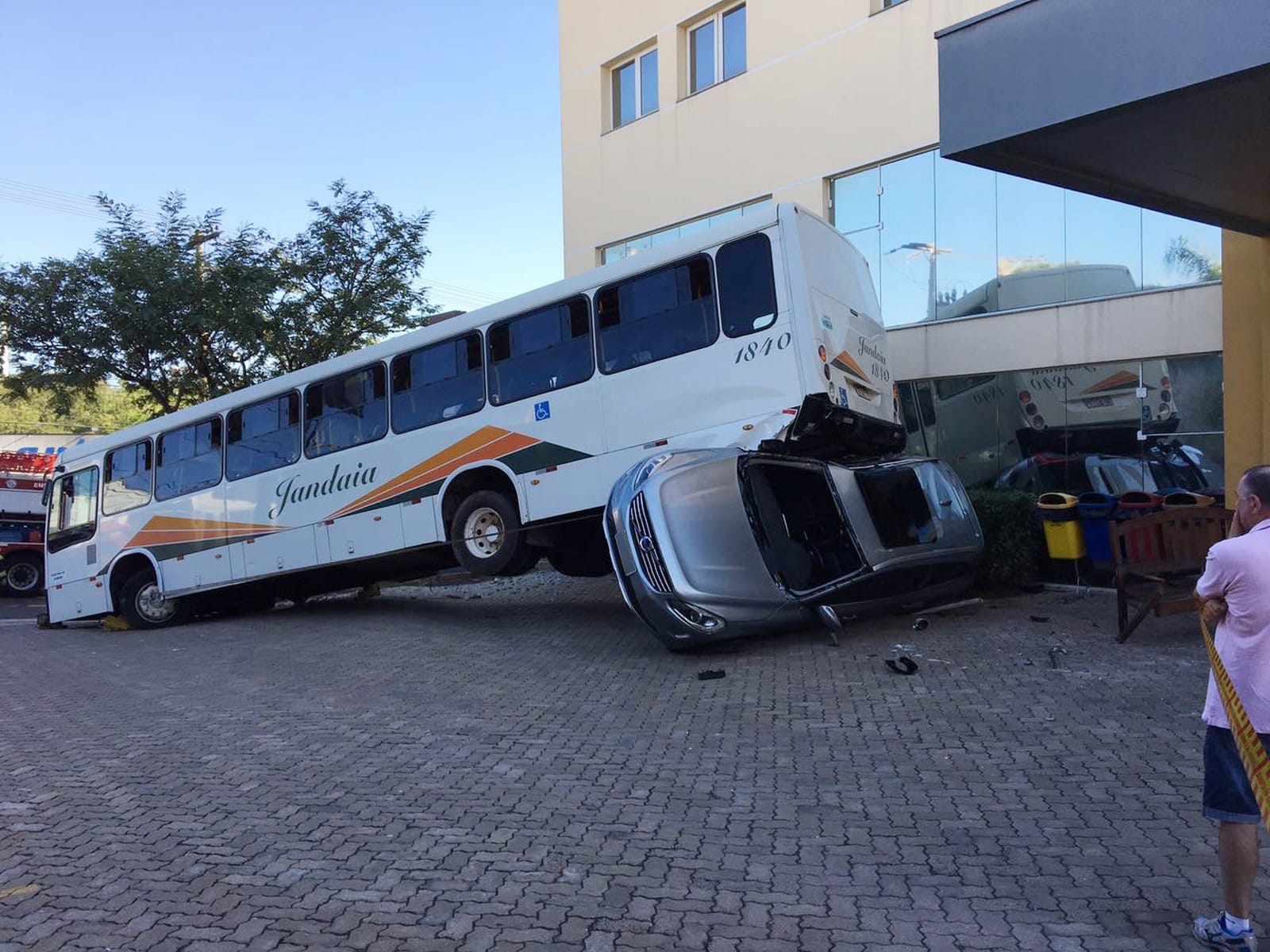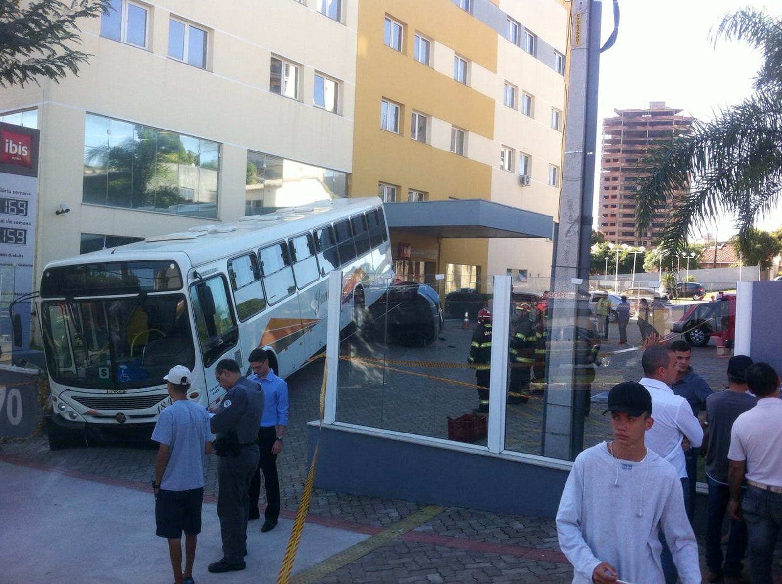 Um ônibus de transporte coletivo intermunicipal invadiu desgovernado na tarde deste sábado (17) um hotel localizado na Avenida Manoel Goulart, na Vila Santa Helena, em Presidente Prudente. Três passageiros foram socorridos com ferimentos leves e levados pelo Corpo de Bombeiros para o Hospital Regional (HR), além do motorista. O ônibus só parou quando atingiu um carro que estava estacionado no pátio do hotel.