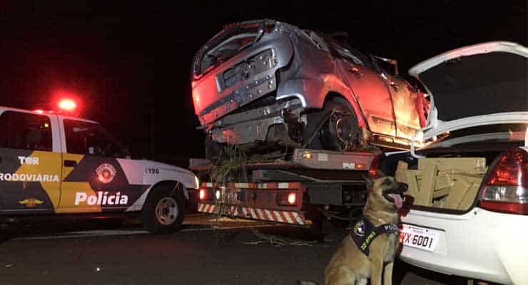 Segundo a Polícia Rodoviária, uma equipe deu sinal de parada para dois veículos. O primeiro, suspeito de escoltar o carro com a droga, parou. O segundo, em que estava a vítima, tentou fugir e capotou.