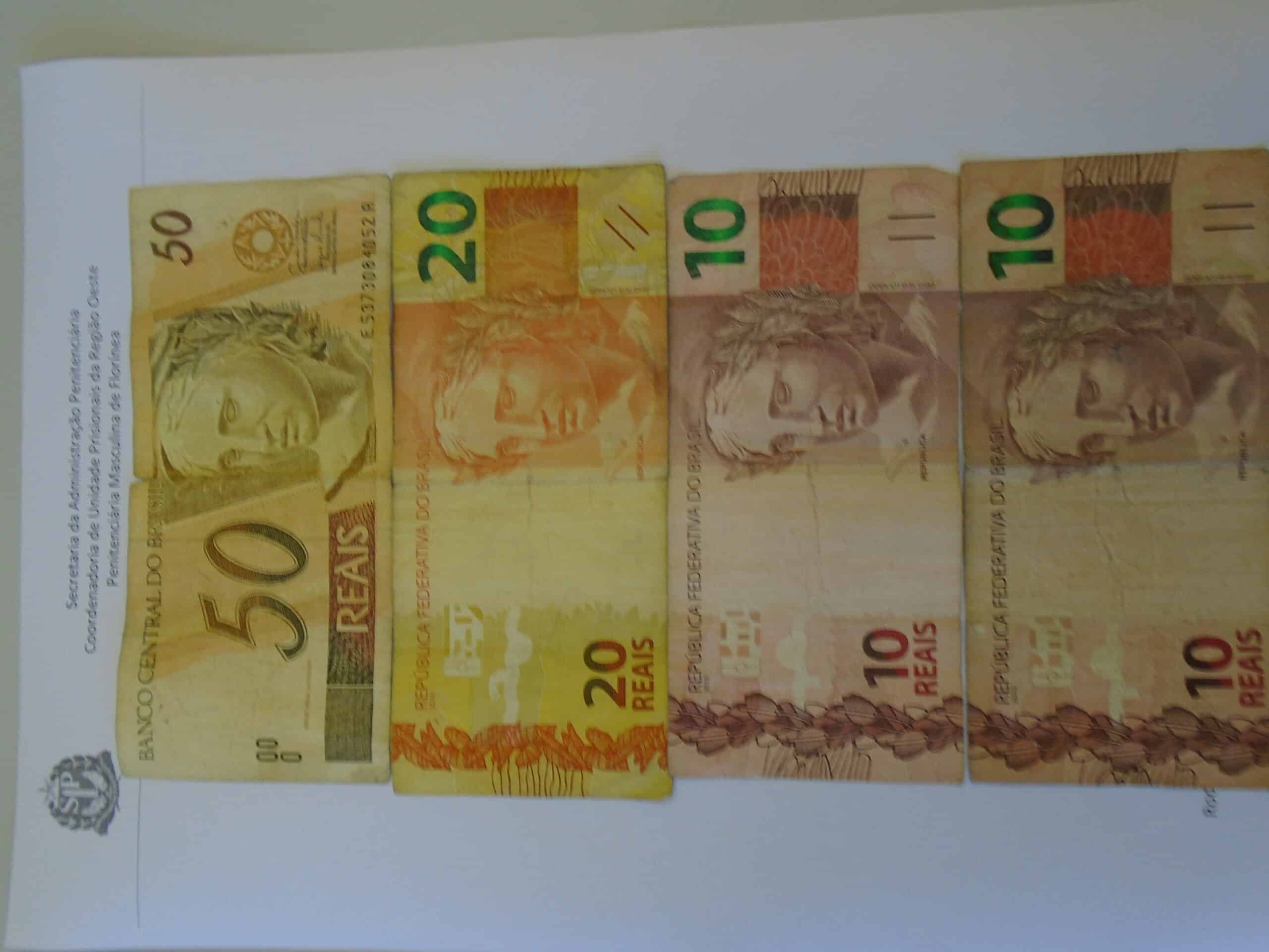 Ao ser questionada, ela informou que se tratava de quatro cédulas de dinheiro: uma nota de R$ 50,00, duas de R$ 10,00 e uma de R$ 20,00.
