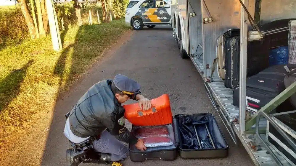 A abordagem foi feita na Rodovia Orlando Quagliato e durante a revista o passageiro, de 38 anos, mostrou nervosismo e foi feita uma revista minuciosa na bagagem dele e foi encontrado um fundo falso em uma mala com dois tabletes grandes de haxixe.