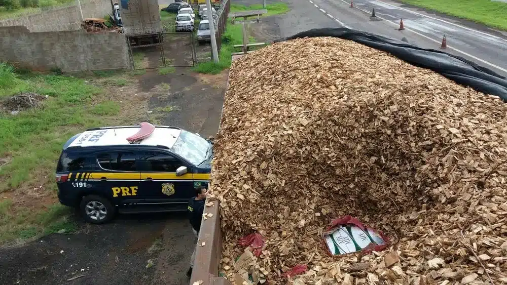 Segundo informações da polícia, as caixas de cigarro estavam cobertas com lascas de eucalipto para disfarçar e enganar a fiscalização.