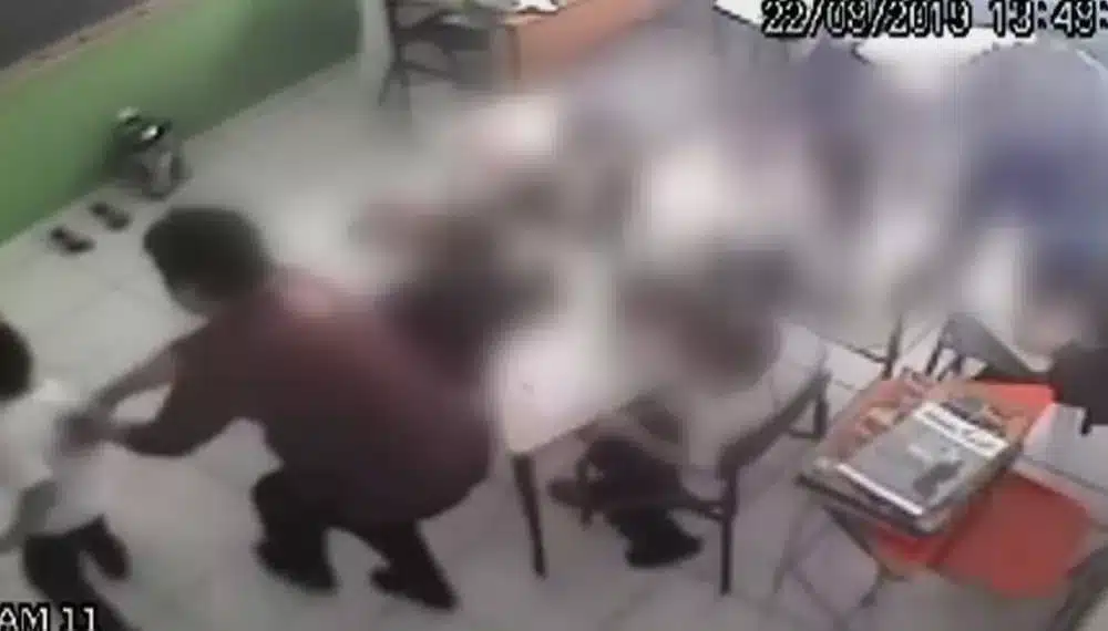 As imagens, registradas no dia 22 de agosto de 2019, mostram que a professora de 61 anos saiu da sala por um momento e um aluno também saiu. Em seguida, a professora voltou correndo segurando o aluno pela camiseta e o empurrou. O menino quase caiu.