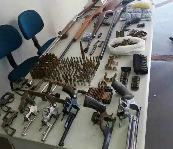 Por volta das 11h40 desta sexta-feira, dia 02, as equipes policiais se deslocaram ao imóvel, localizado na Avenida Arthur Ebel, na Vila Galdino, onde encontraram o morador do local e a sua companheira. O indiciado, de 46 anos, foi questionado sobre se ele possuía armas de fogo no local, ele mostrou onde estava um revólver, municiado, como também o registro da arma. No quarto do casal, foram localizadas mais duas armas de fogo e no quintal havia uma oficina de armeiro, com mais armas, dezenas de munições e uma grande quantidade de peças de armas.