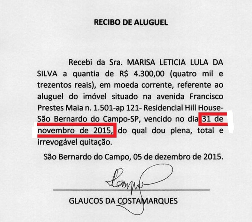 Dois recibos apresentados pela defesa do ex-presidente Luiz Inácio Lula da Silva para comprovar o pagamento de aluguel de um apartamento alvo de investigação da Operação Lava Jato trazem datas que não existem no calendário. Em um deles, consta que a quitação era referente ao aluguel vencido no dia 31 de junho de 2014, e o outro no dia 31 de novembro de 2015.