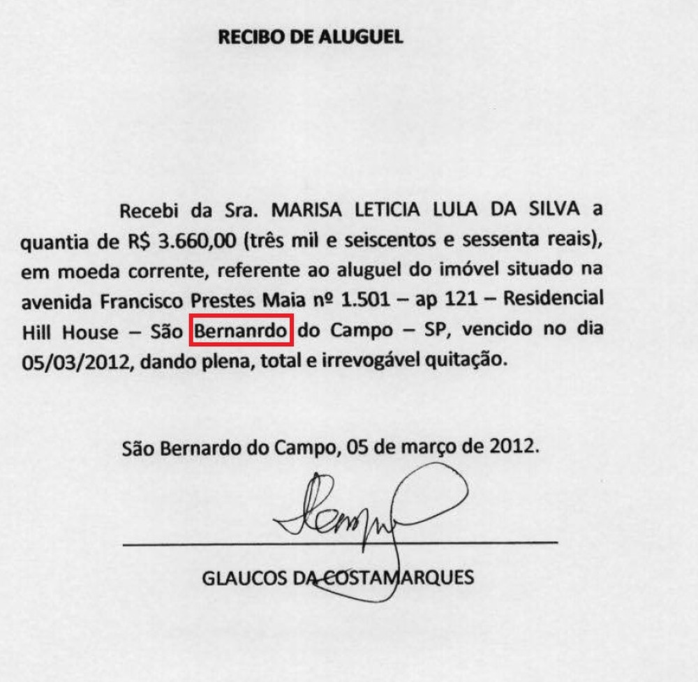 Nos documentos entregues também há erro na grafia da cidade em que o apartamento fica, escrita como “São Bernanrdo do Campo”.