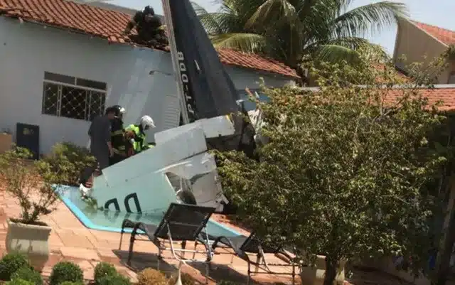 As imagens mostram que o o bico do avião se chocou contra o solo do quintal da residência. Parte da asa ficou dentro da piscina.