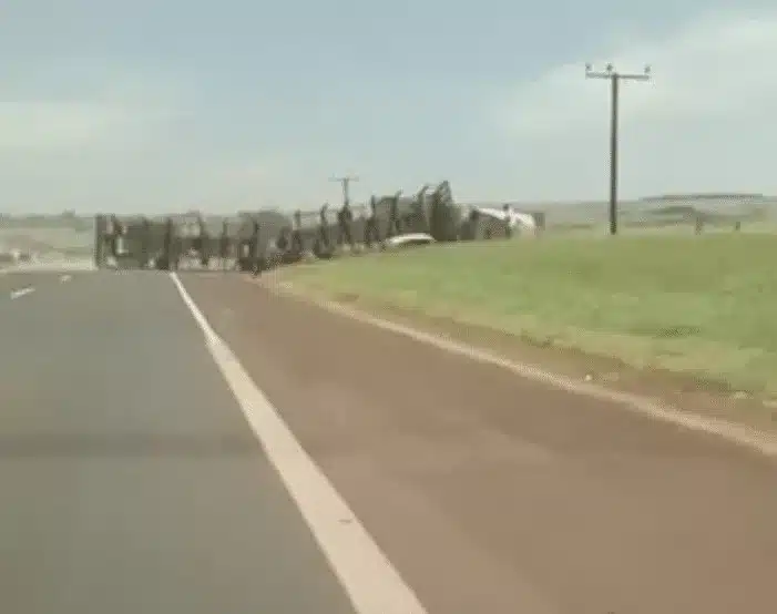 Uma carreta canavieira tombou na Rodovia Raposo Tavares, em Ourinhos (SP), após cruzar a pista e passar sobre a proteção de concreto. O acidente foi na tarde desta segunda-feira (21).