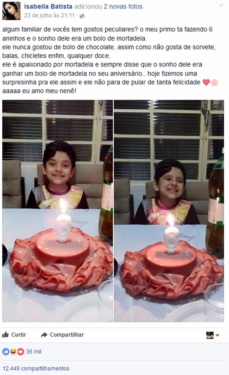 “Não gosta de nada. Nem bala, chiclete, pirulito, nem chocolate. E estávamos organizando a festinha de aniversário, quando o Isaac disse que queria um bolo de mortadela, então resolvemos fazer”, disse a mãe da criança, a vendedora Leide de Souza, 36 anos.