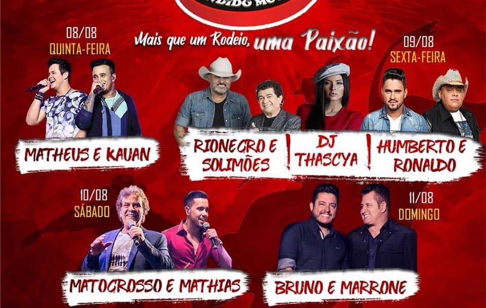 No sábado, dia 10, o palco será de Matogrosso e Mathias. O rodeio será encerrado com Bruno & Marrone. “É uma grade de shows especialmente pensada e concebida para agradar a todos os gostos. São shows de grande qualidade e que com certeza irão levantar o público no recinto”, ressaltaram os organizadores.