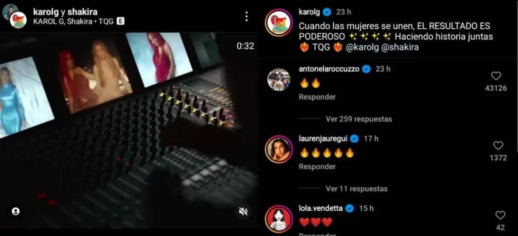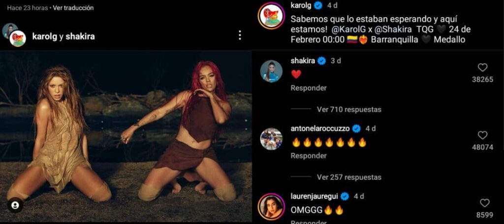 “Quando as mulheres se unem, O RESULTADO É POWERFULO. Fazendo história juntos. TQG. @karolg @shakira”.