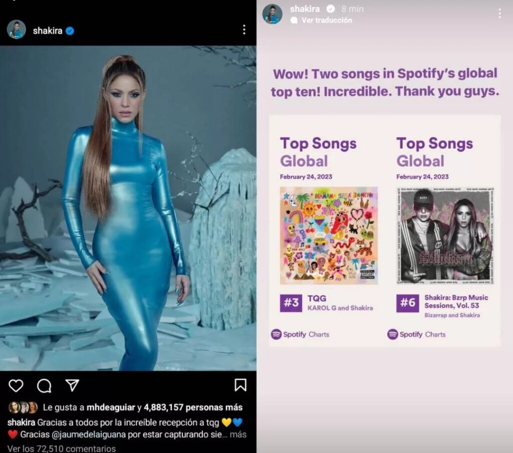 TQGa nova canção de Shakira e Karol G, classificada como número 3 no Top 10 global da Spotify. com 7.675.876 peças.