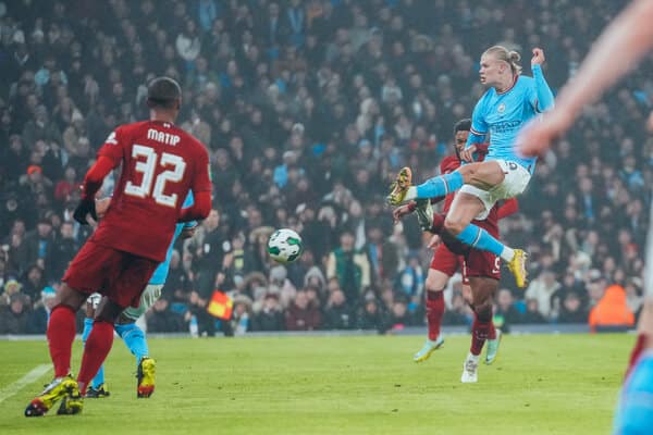 De Bruyne está saindo de uma assistência na partida da Copa Carabao contra o Liverpool. Enquanto Haaland marcou na mesma partida e tem quatro gols graças aos passes do belga.