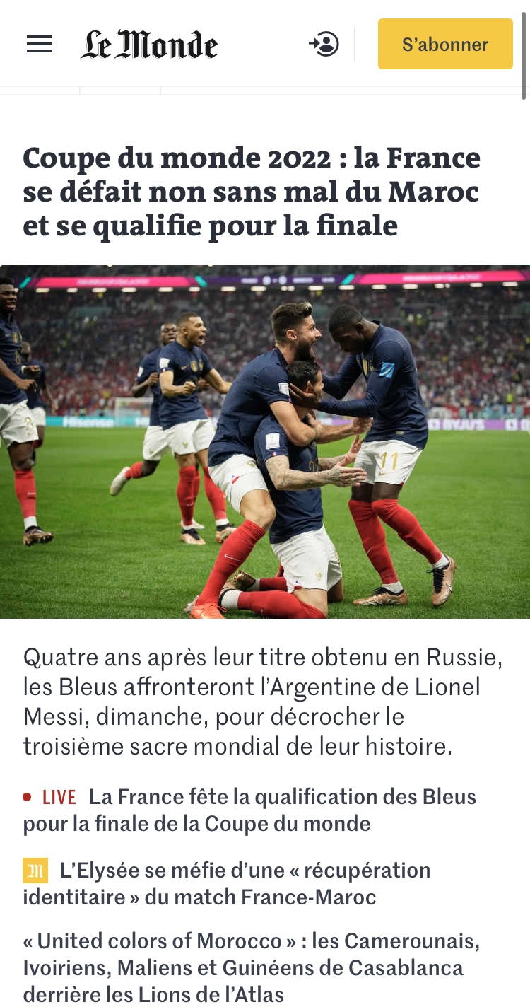 “França – Marrocos: os Blues põem fim à aventura do Atlas Lions e vão para a final”, foi a manchete do Le Monde.