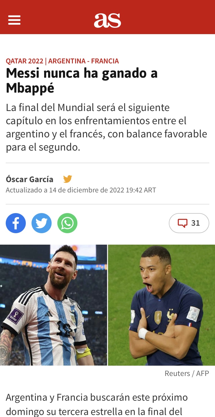 Da mesma forma, já estão a viver o jogo de domingo entre os sul-americanos e os europeus. Com uma expressão que poderia causar controvérsia: “Messi nunca venceu Mbappé”.